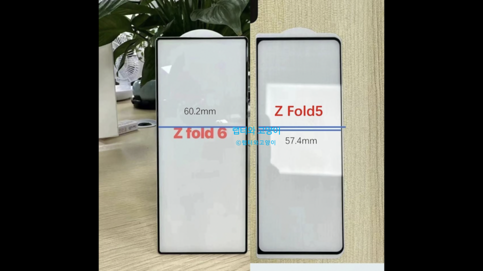 먼저 폴드6부터 살펴보겠습니다. 이번에 유출된 사진은 바로 폴드6의 전면 보호 필름이 유출되었습니다. 확실히 전작인 폴드5보다 화면이 가로방향으로 더 넓어진 것을 알수 있습니다. 이 정도면 현재 S24 울트라나 S24 플러스의 화면크기와 비슷한 정도로 보입니다. 화면비도 비슷할 듯하고요. 폴드5의 화면비가 23.1:9인데요. 변경된 폴드6의 커버화면비는 20:9~21:9 정도는 되어보입니다. 현재 S24 울트라의 화면비가 19.5:9인데 이대로 출시된다면 화면비는 바형 스마트폰과 비슷해지는 것입니다.
