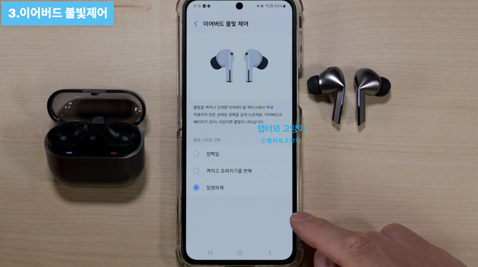 이 때 불빛 스타일을 바꾸면 기분에 따라서 사용할수 있습니다. 이어버드 제어로 들어가서 이어버드 불빛제어로 들어가면 됩니다. 여기서 내가 원하는 스타일로 설정을 하시면 됩니다.