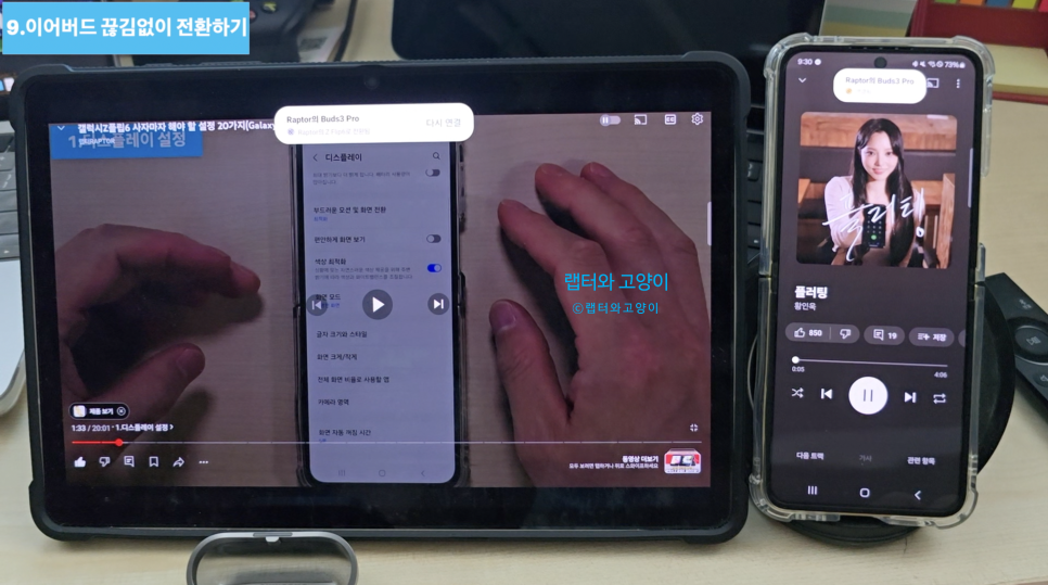 9번째로 이어버드 끊김 없이 전환하기입니다. 이 기능은 같은 계정의 삼성 기기를 사용할 때 해당 기기에서 음악이나 유튜브를 보게 되면 자동으로 스위칭해주는 기능입니다. 정말 편한기능이고 지금도 잘 사용하고 있는데요. 가끔 불편할 때가 있습니다. 언제냐 하면 태블릿으로 음악이나 영상을 보고 있을 때 스마트폰에서 유튜브 영상이나 간단한 영상을 볼 때 스마트폰으로 자동으로 연결될 때 불편하거든요.