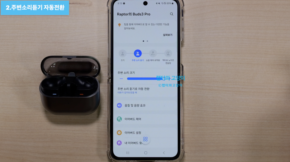 2번째로 주변 소리 듣기로 자동 전환 기능입니다. 이 기능은 노캔 상태에서 대화감지나 사이렌이 감지되면 자동으로 주변 소리 듣기로 바꿔주는 기능입니다. 대화감지는 상당히 자연스럽게 제어를 잘해줬습니다. 버즈2 프로에서 불편해 던점이 개선이 된 것같고요.