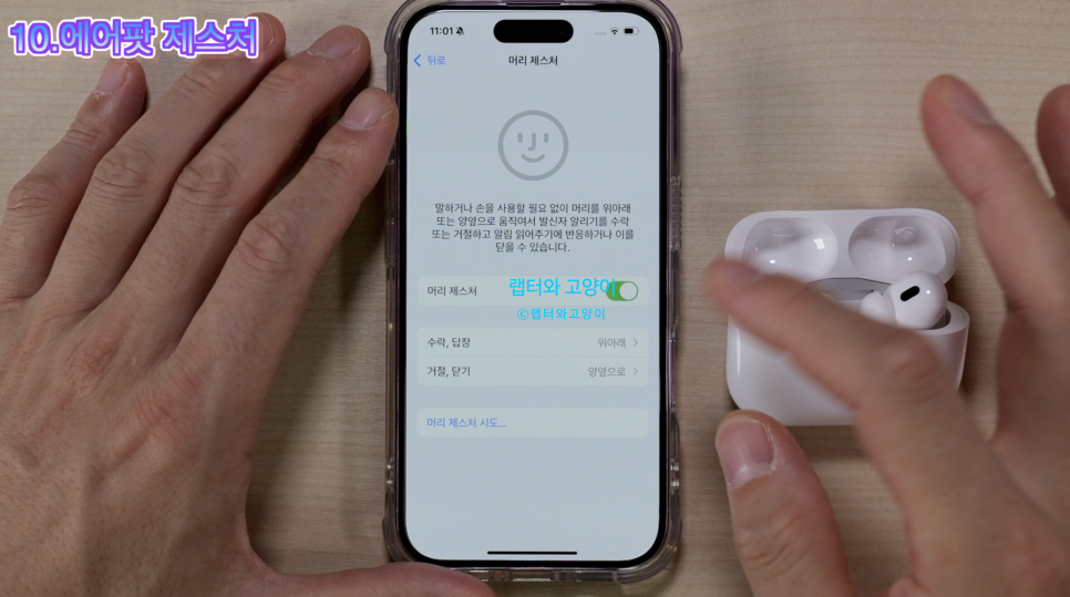 여기서 머리제스처르로 들어가서 기능을 켜면 됩니다.하단에 보면 머리 제스처 시도로 들어가면 테스트를 해볼수 있습니다.