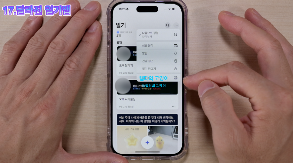 17번째로 달라진 일기앱입니다. 일기앱을 켜서 보면 우측상단에 더보기를 눌러보면 건강접근과 프린트 기능이 생긴 것을 볼수 있죠. 건강접근을 눌러서 마음상태와 마음 챙기기 시간을 켜줍니다. 그리고 일기를 작성하면 됩니다.