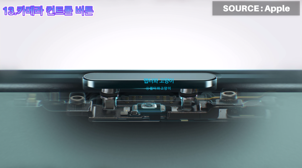 13번째로 카메라 컨트롤 버튼입니다. 이번 아이폰16 시리즈에 새롭게 들어간 버튼인데요. 카메라 전용 컨트롤 버튼이라고 생각하시면됩니다.