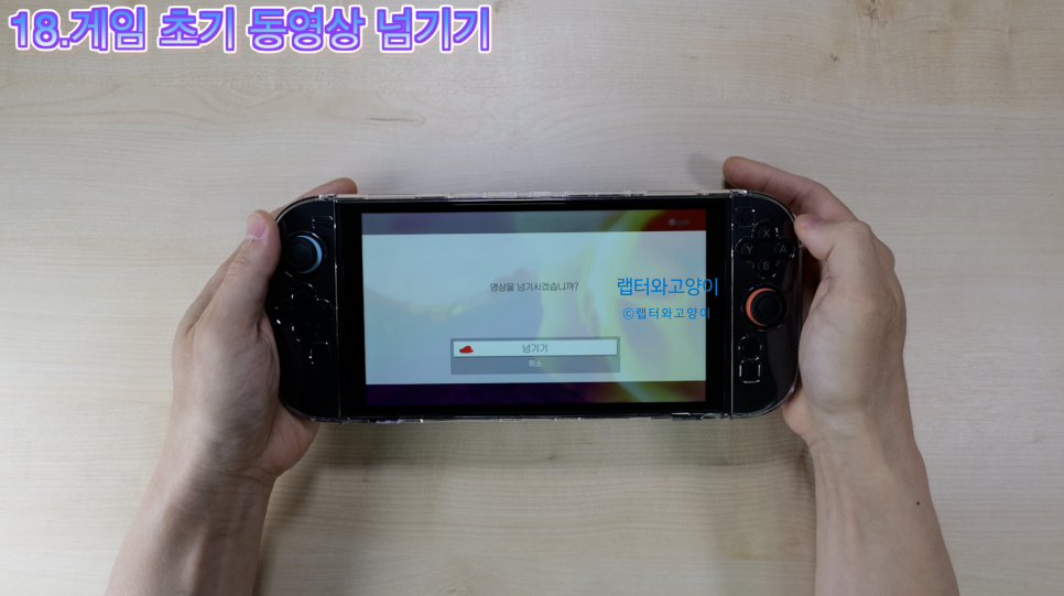 18번째로 게임 초기 동영상 넘기기 입니다. 이렇게 게임을 처음 시작하거나 중요한 이벤트때 나오는 동영상을 보기 싫을 때가 많죠. 그렇때 오른쪽조이콘의 플러스 버튼을 누르면 동영상을 건너뛸수 있습니다.