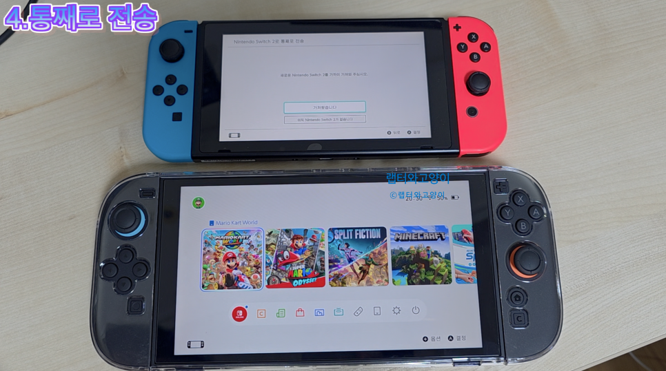 4번째로 통째로 전송 기능입니다. 통째로 전송 기능은 2가지 방법으로 할수 있는데요. 첫번째는 스위치2를 초기 설정하는 과정에서 바로 전송 할수 있는 방법이 있고요. 또는 초기 설정에서 하지않고 나중에 할때는 스위치1에서 통째로 전송하기를 실행하시면 되는데요. 현재 스위치2를 가지 있는 분들은 가져왔습니다를 선택하시면 되고요. 스위치2가 없는 분들은 아직 닌텐도 스위치2가 없습니다를 선택하시면 됩니다.