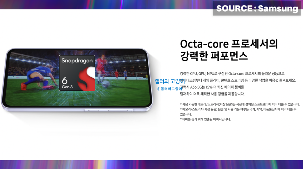 그러지 않고 스냅드래곤 6 Gen 3가 탑재되었습니다. 이유가 있는데요. 바로 스냅드래곤6 3세대를 삼성파운드리에서 생산하기때문에 원가절감을 할수 있기때문이죠.