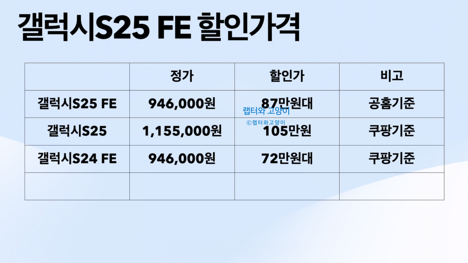 현재 S25는 쿠팡 기준으로 할인 받아서 100만원대에 구매를 할수 있는데요. 가격차이가 거의 18만원~20만원 정도 차이가 나기때문에 고민이 될겁니다. 또한 전작인 S24 FE는 현재 쿠팡기준으로 할인을 받아서 70만원초반대에 구매가 가능합니다.