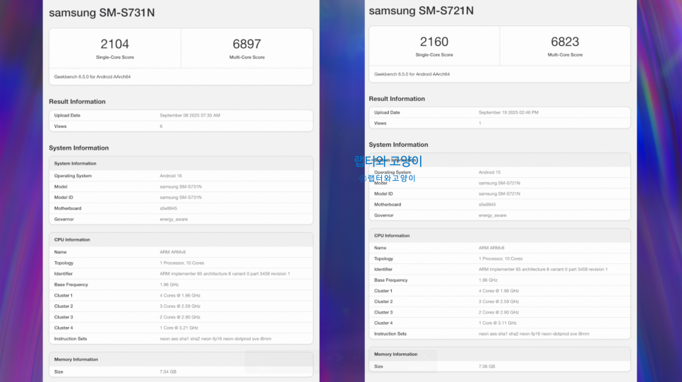 먼저 AP는 삼성 엑시노스 2400이 적용되었습니다. 제가 다른 영상에서도 말씀드렸지만 전작인 S24 FE대비 성능향상이 거의 없다고 보시면 됩니다. S24 FE의 엑시노스2400e보다 빅코어의 클럭수가 소폭 더 높은 정도라서 그렇고요. 실제로 긱벤치 점수를 보면 지금 보시는 점수는 싱글코어가 S24 FE가 소폭 더 높은 것을 볼수 있고요. 멀티코어도 S24 FE가 더 높게 나올 때도 있습니다. 그러니까 두모델의 성능차이가 거의 없다는 것이죠.