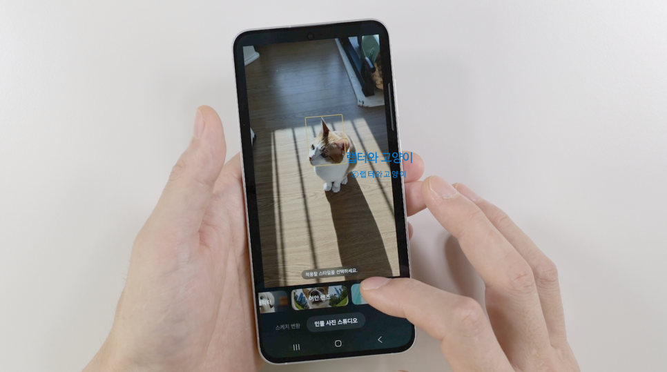 그리고 강아지나 고양이의 얼굴이 조금이라도 인식이 되면 인물사진 스튜디오를 사용할수 있는데요. 여기서 어안렌즈를 사용할수 있습니다. 정면으로 찍은 사진이 아니더라도 AI가 알아서 실제 어안렌즈로 찍은 듯한 모습으로 만들어줍니다. 귀여운 사진을 만들수 있어서 마음에 들었습니다.