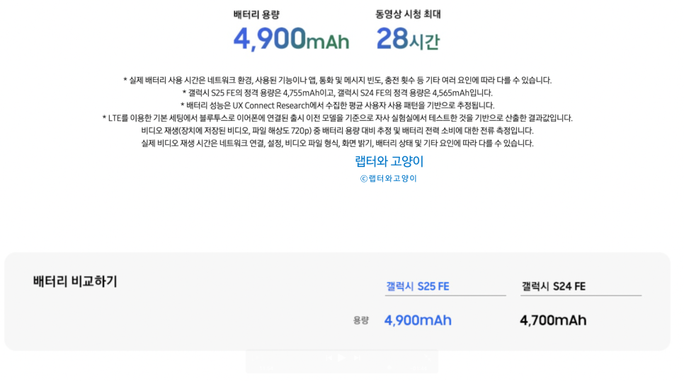 스펙상 사용시간은 동영상을 28시간 정도 볼수 있습니다. 이것은 전작인 S24 FE와 동일한 시간이죠.그도 그럴 것이 AP가 거의 동일하기때문이죠.