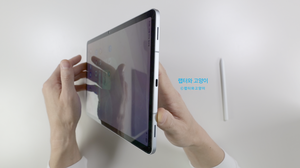 그리고 전면카메라는 전작인 탭S9 와 동일한 12MP이 적용되어있습니다. 그리고 측면을 보면 전작인 탭S9와 표면 질감이 거의 비슷합니다.