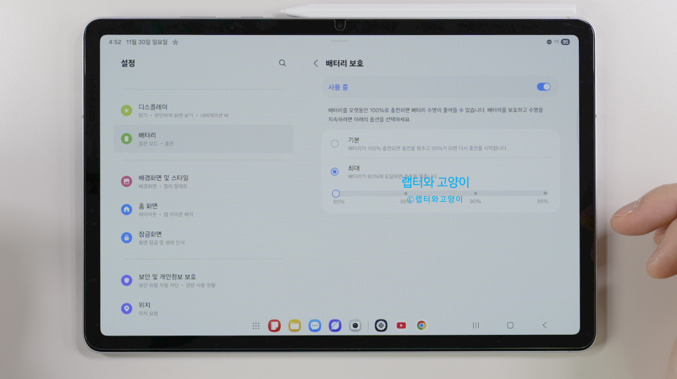 그리고 탭S11에도 배터리 보호 설정이 개선되었습니다. S25 시리즈처럼 세분화 되어있고요.설정에서 배터리로 들어가서 배터리 보호에 보면