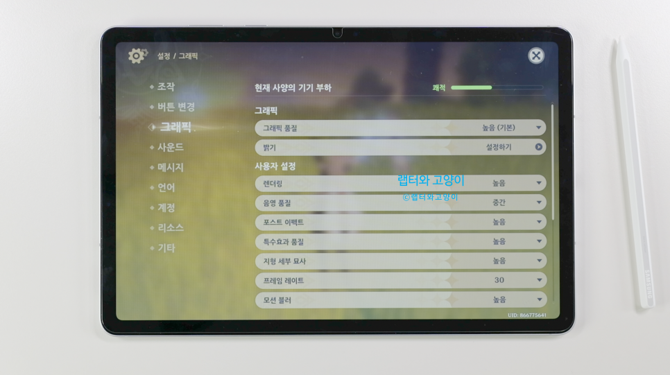 그리고 그래픽 설정을 보면 탭S11이 높음이 기본입니다. 솔직히 다른 영상을 찍을 때 조금 놀라기도 했던 부분이거든요. 저는 중간이 기본일줄 알알았거든요.