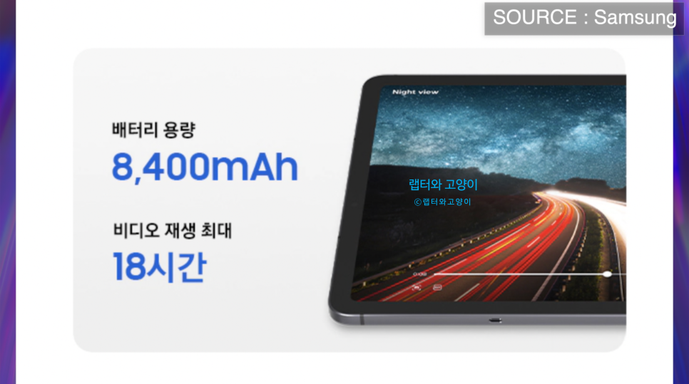 스펙상 동영상 재생시간은 18시간인데요. 탭S9보다는 사용시간이 3시간 더 늘어났습니다.