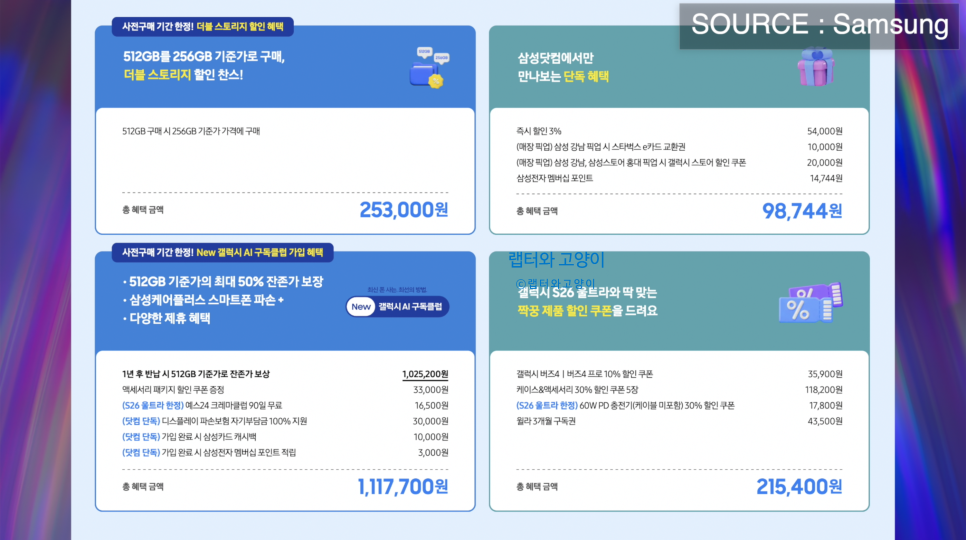 그러면 이런 의문이 생기죠. 울트라는 1TB를 사는 것이 이득아니냐 그런 생각이 들죠. 삼성이 어떤 회사입니까? 인상액의 절반을 넘는 253,000원만 할인받을수 있습니다.