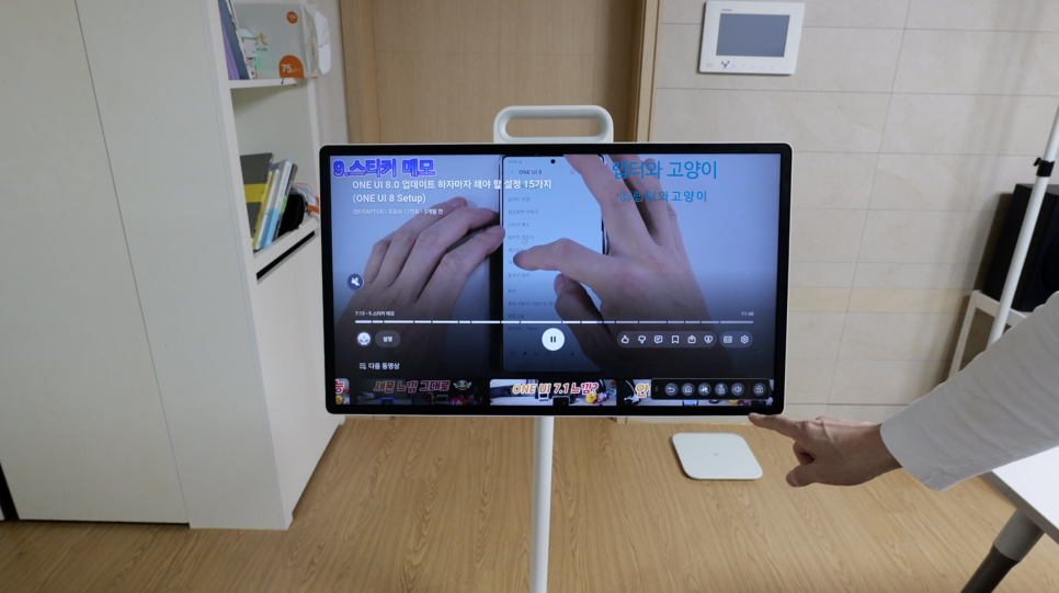 그리고 이 상태에서 손잡이를 뒤로 밀어서 각도를 조절할수 있거든요. 저는 밥먹을 때 항상 이렇게 해놓고 밥을 먹기때문에 영상을 볼때 태블릿 보다 보는 맛이 상당히 좋습니다.