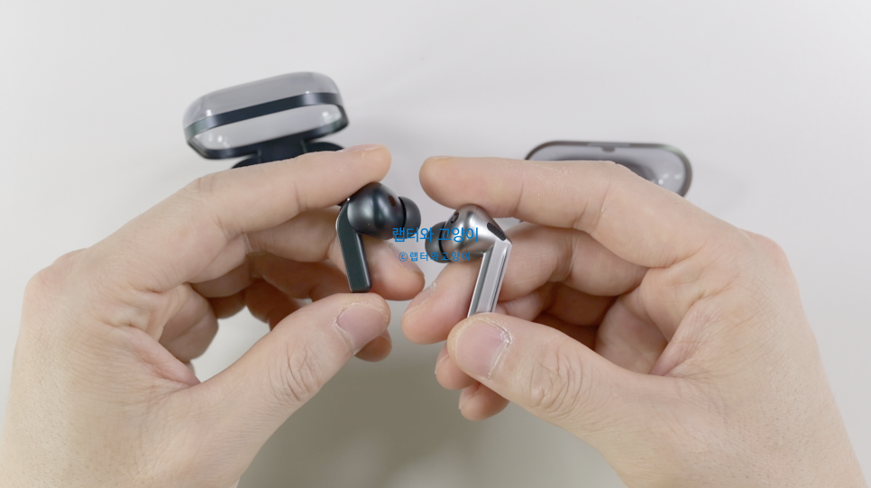 그리고 조작감은 두 모델 모두 스템형이어서 핀치 컨트롤 방식으로 제어를 할수 있는데요. 앞에서 말씀드렸지만 버즈3 프로같은 경우는 모양이 다각형이어서 그립감이 별로였거든요.